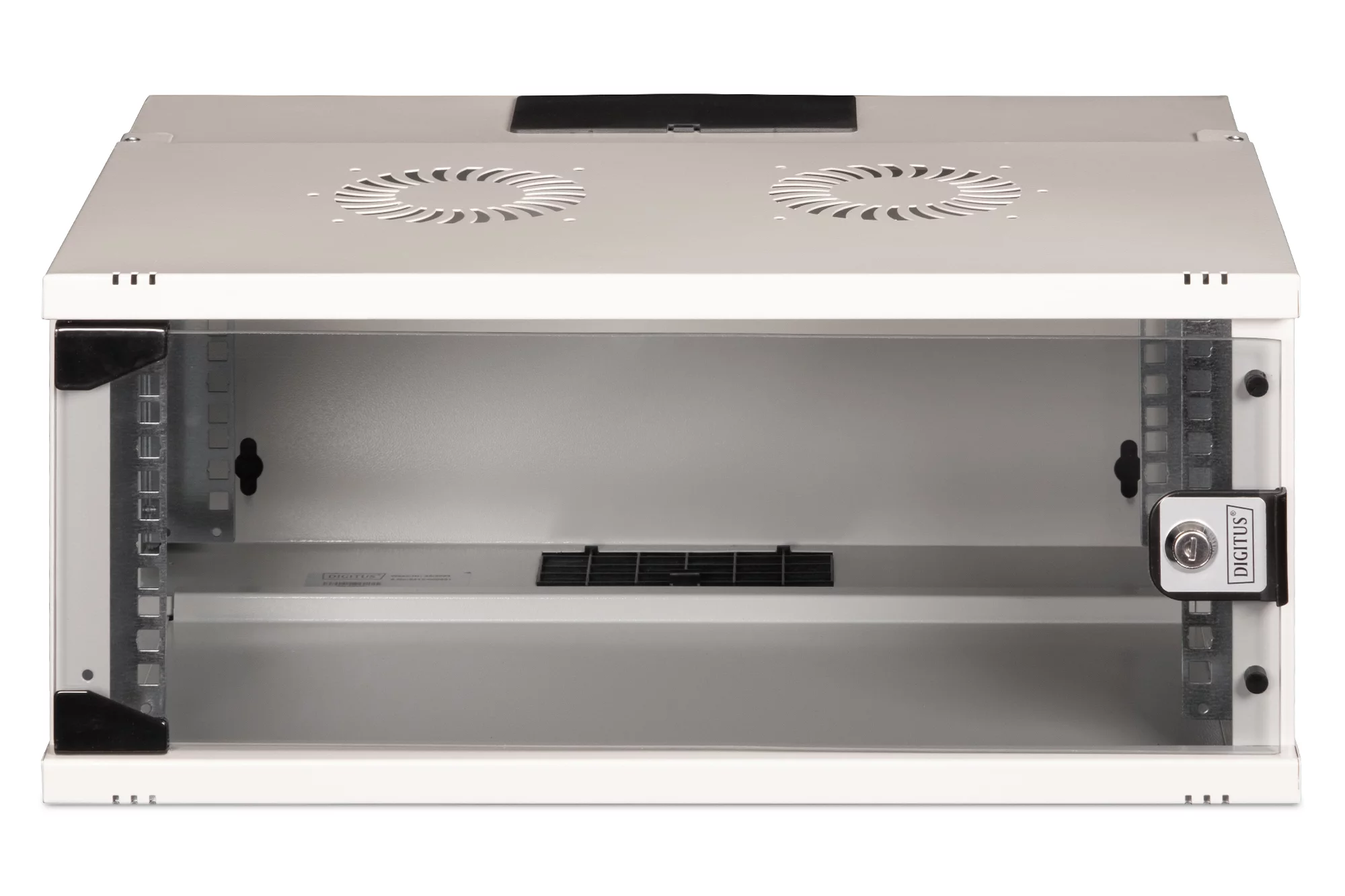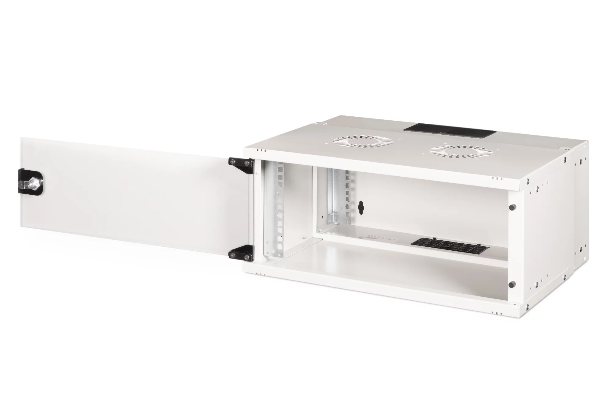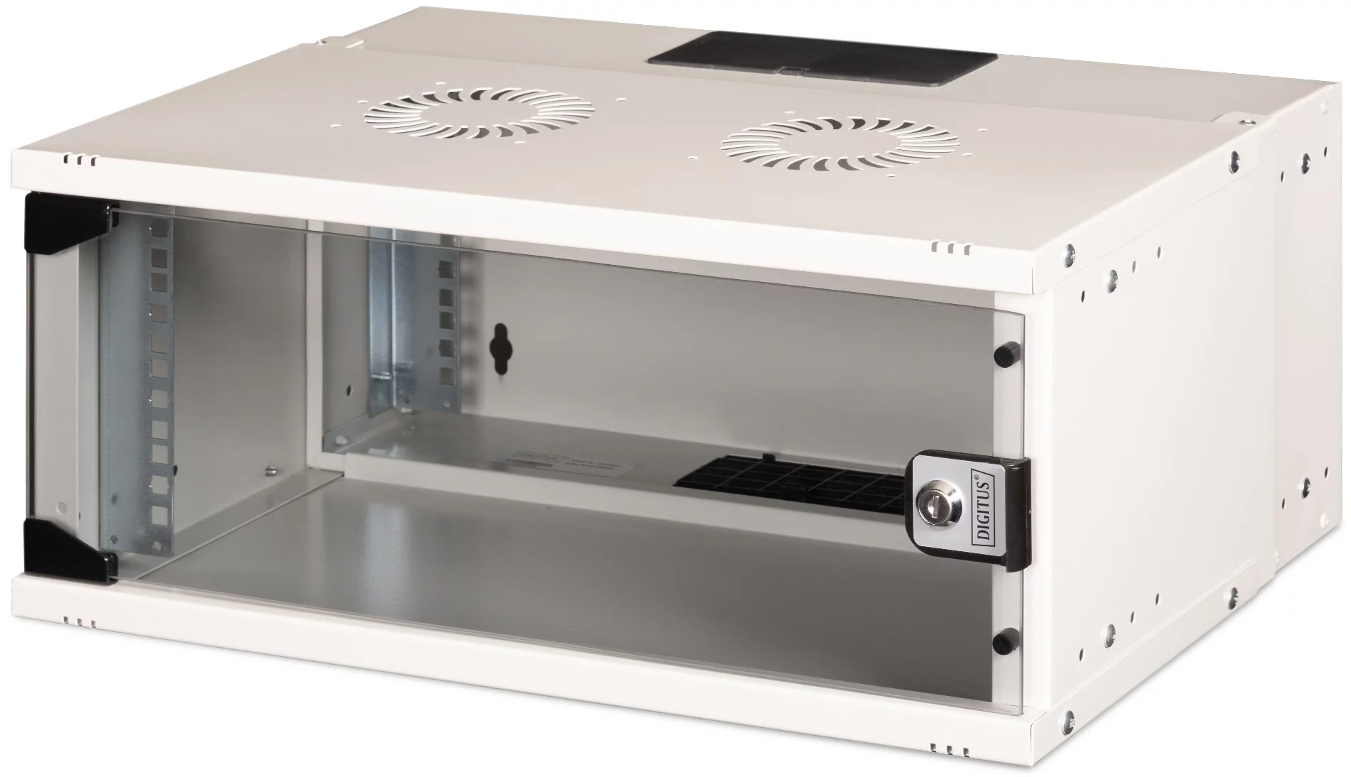 DIGITUS SOHO PRO DN-49200 — настінна 19" шафа 4U для домашніх і офісних мереж. Сталевий корпус із порошковим покриттям, скляні двері з замком, дві пари регульованих 19" рейок, кабельні вводи зверху/знизу, вентиляція, клас захисту IP20, вантажопідйомність до 60 кг. Постачається в розібраному стані.