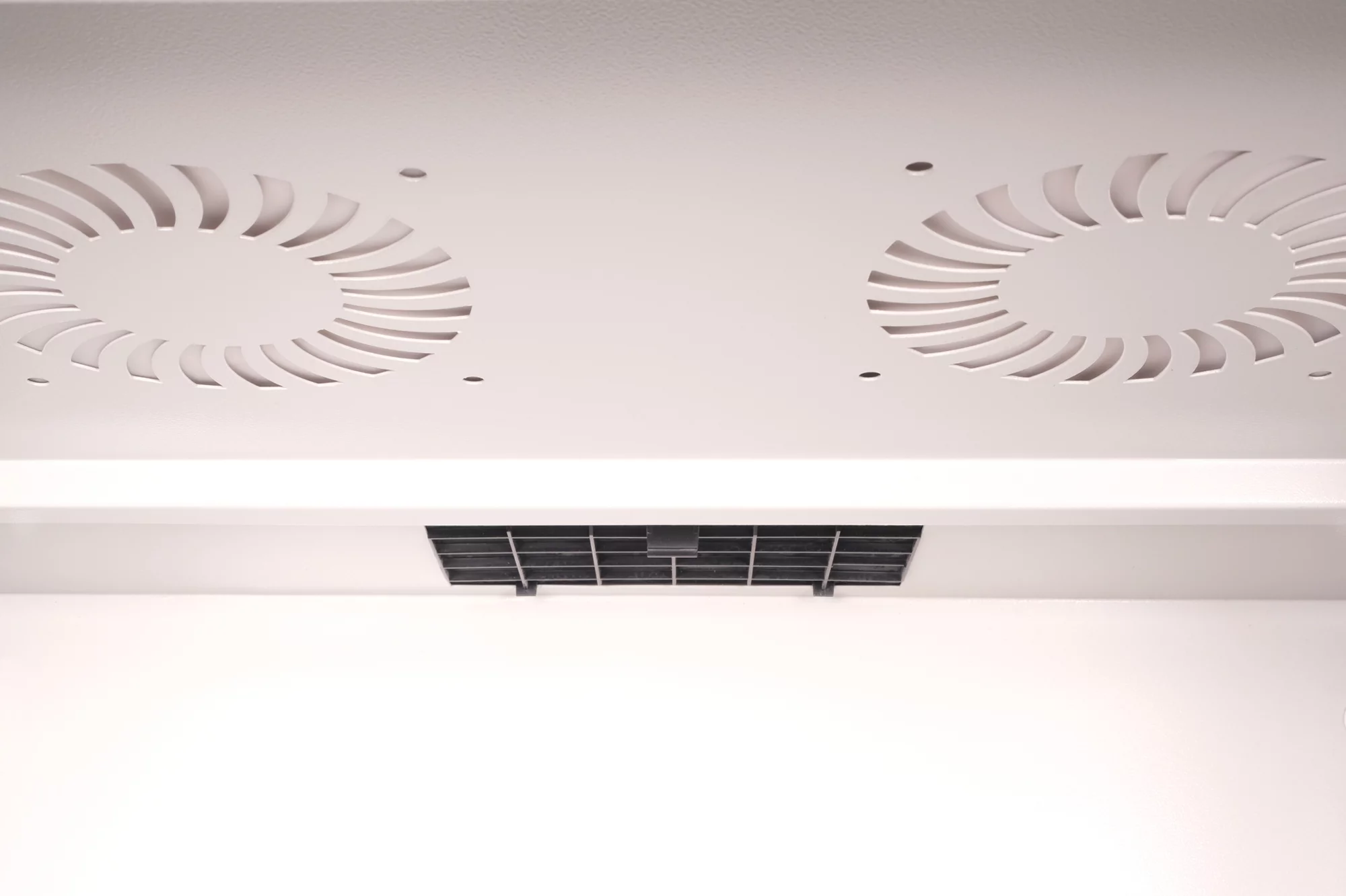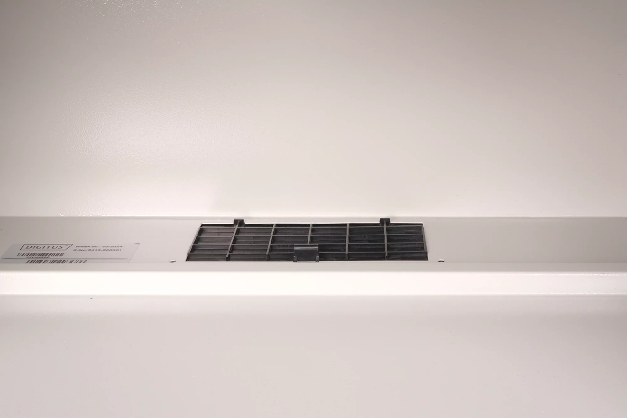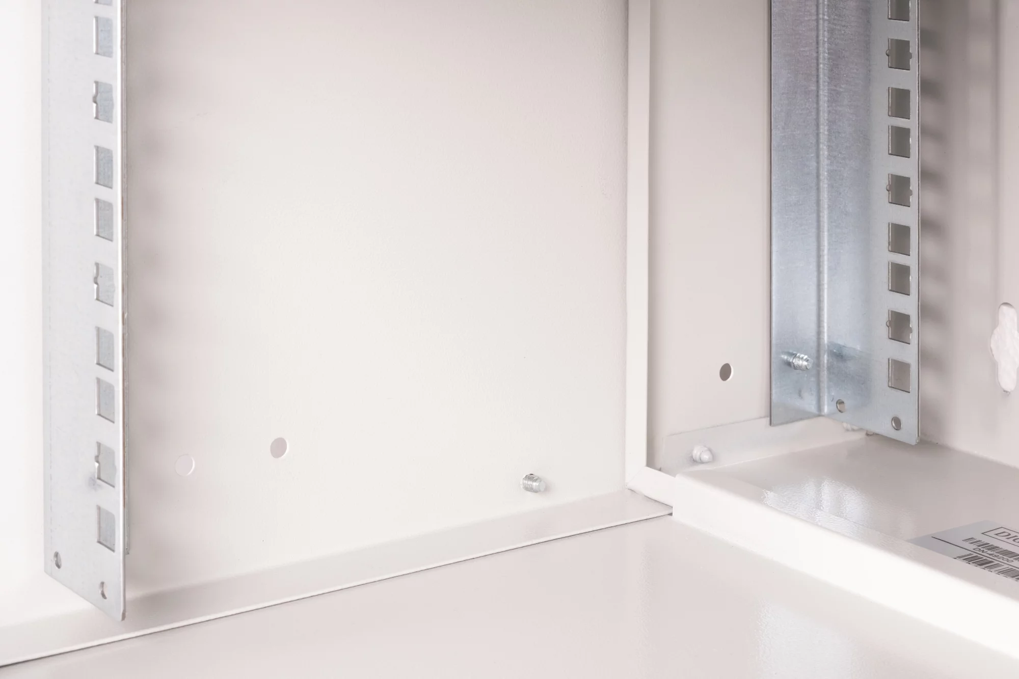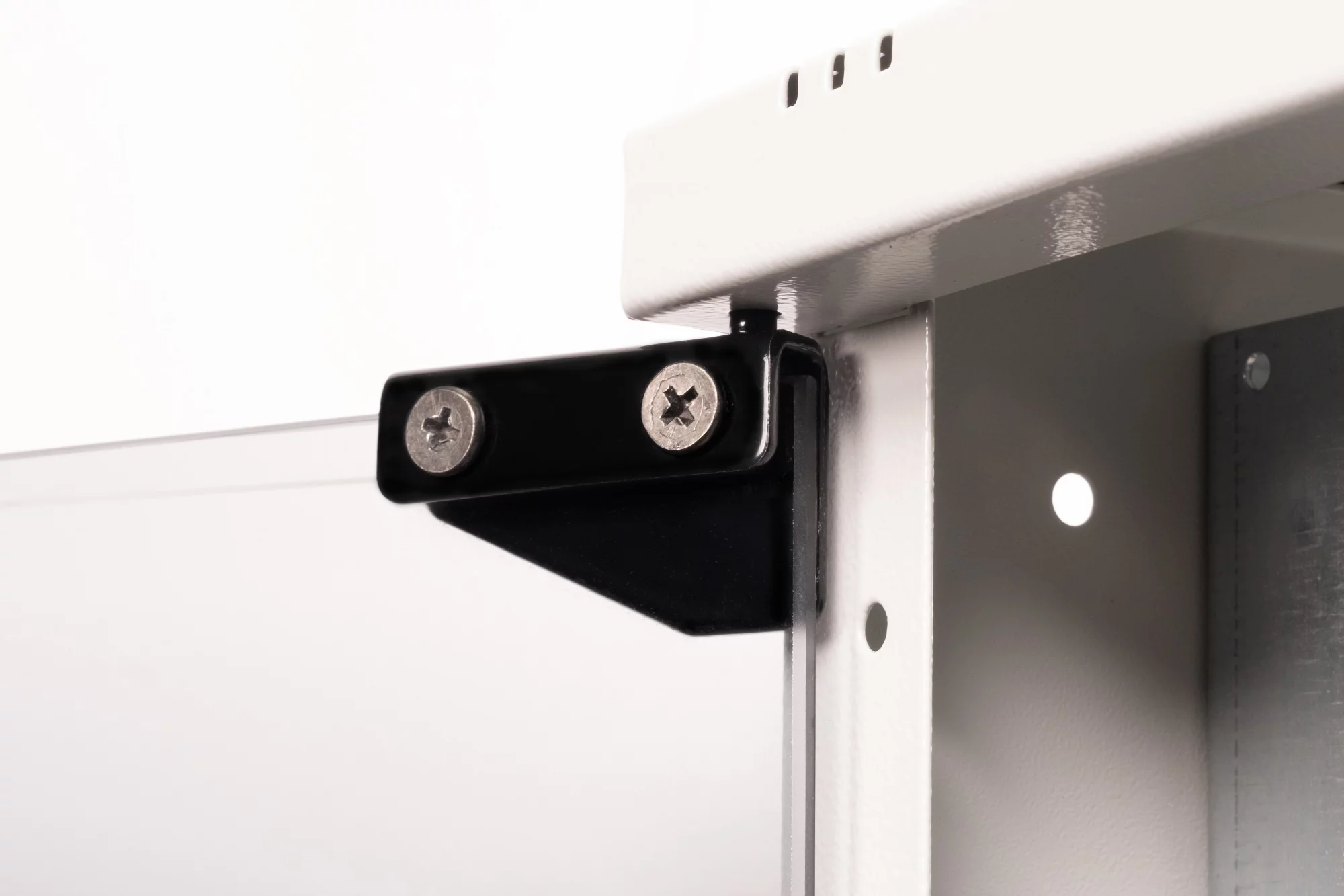 Бічні панелі: з обох боків, Вентиляційні отвори для активної та пасивної вентиляції, Кабельний ввід з пластиковою кришкою у стелі та підлозі, Кут відкривання дверцят 200°, Постачається в розібраному стані, Профільні рейки 483 мм (19`), встановлені спереду всередині корпусу, оцинковані, регулюються по глибині, скляні передні двері, одностороннє відкриття, Ступінь захисту IP 20, 1-точковий замикаючий механізм на передніх дверях