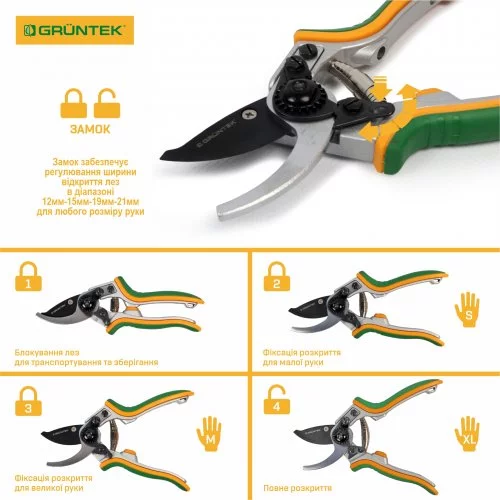 - Регулювання ширини розкриття лез і ручок, завдяки чому кожен користувач може налаштувати секатор під свою руку. Леза секатора можуть розкриватися на ширину 12/15/19/21 мм + транспортувальне положення.