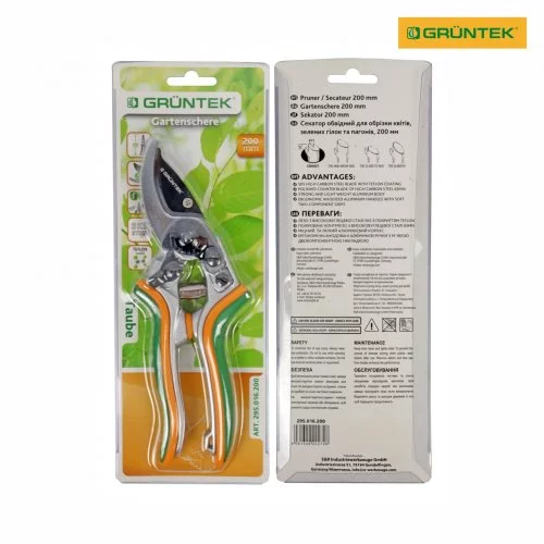 - Загальна довжина секатора GRUNTEK Taube становить 200 мм, невеликі габарити дають змогу працювати з цим садовим інструментом навіть у важкодоступних місцях.