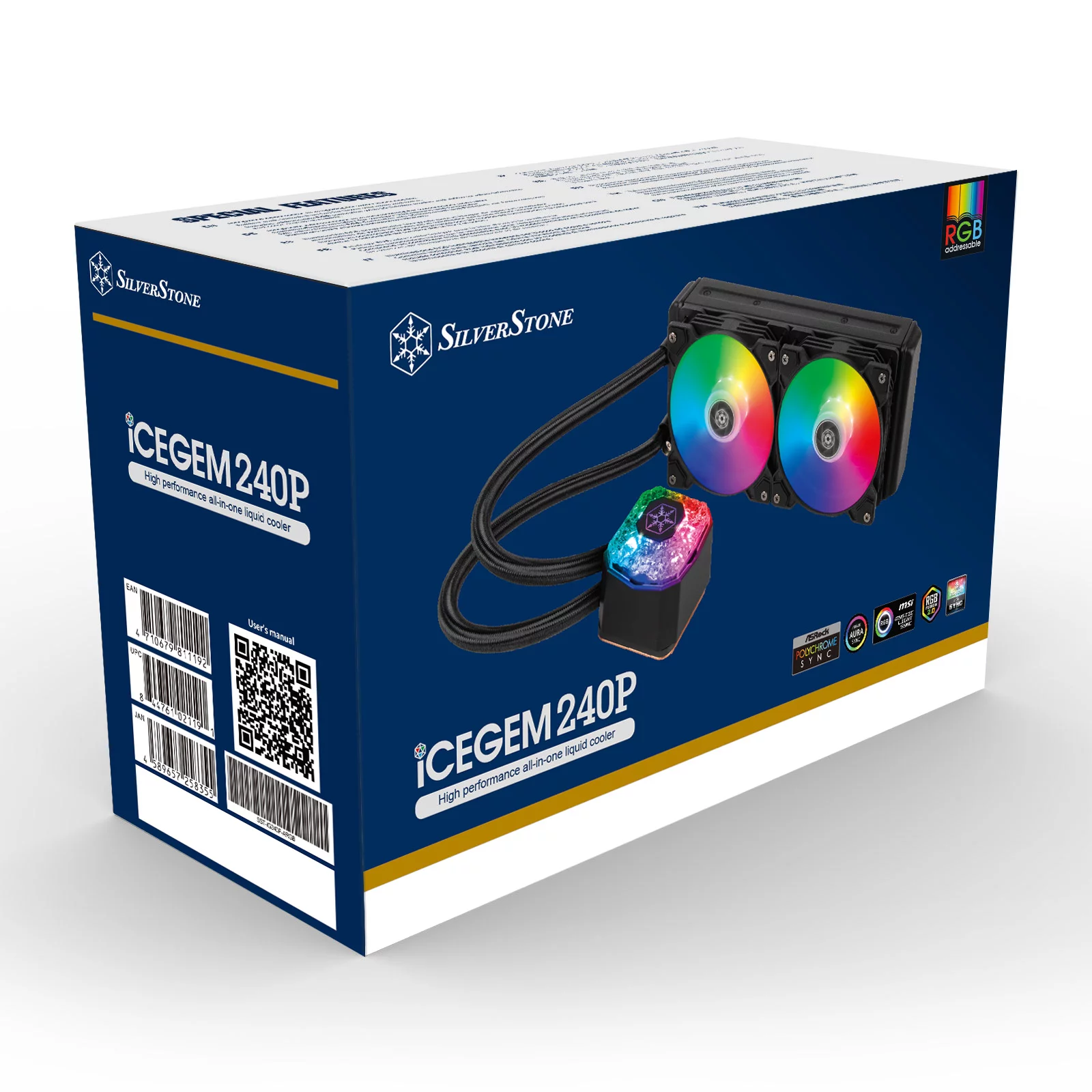 240 мм високопродуктивний рідинний охолоджувач ARGB AIO з двома вентиляторами ARGB по 120 мм. Велика мідна нижня поверхня повністю закриває процесор AMD Ryzen Threadripper, забезпечуючи кожному ядру самий прямий ефект охолодження. 11-лопатеві лопаті вентилятора високого тиску для максимального відведення тепла. Блискучий алмазний дизайн з логотипом SilverStone. Вбудована адресна RGB-підсвічування для водяного блоку і вентиляторів. Включає адресний RGB контролер з 10 режимами освітлення і можливістю регулювання яскравості і швидкості зміни кольору.