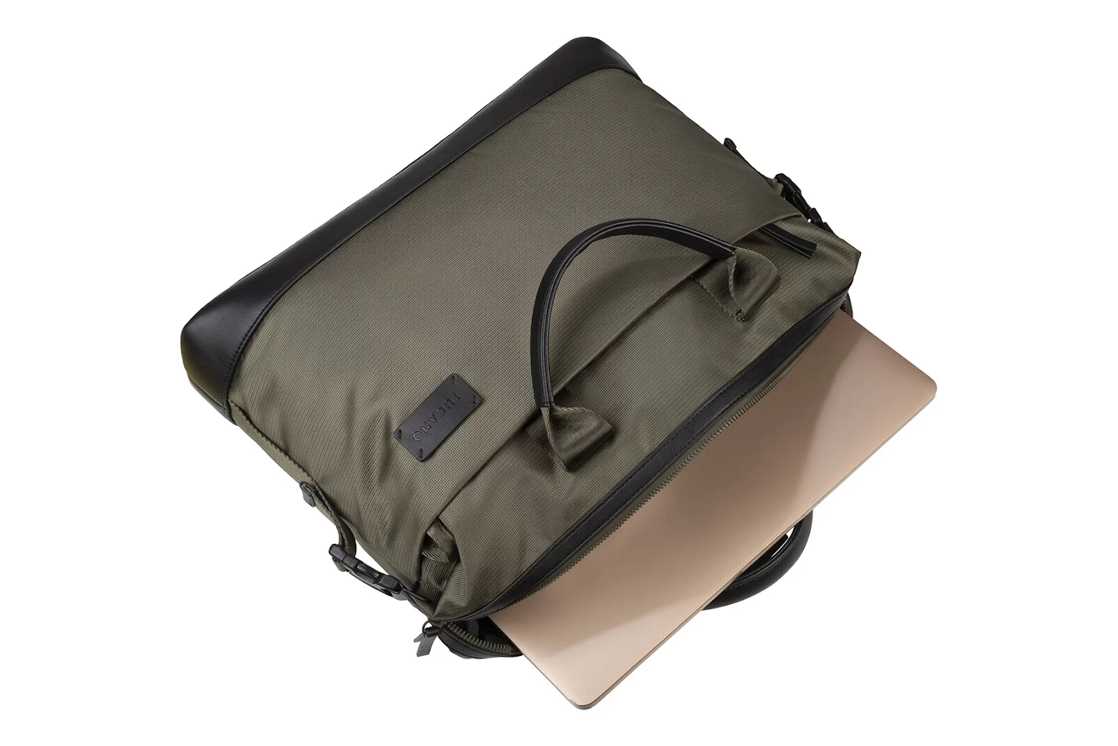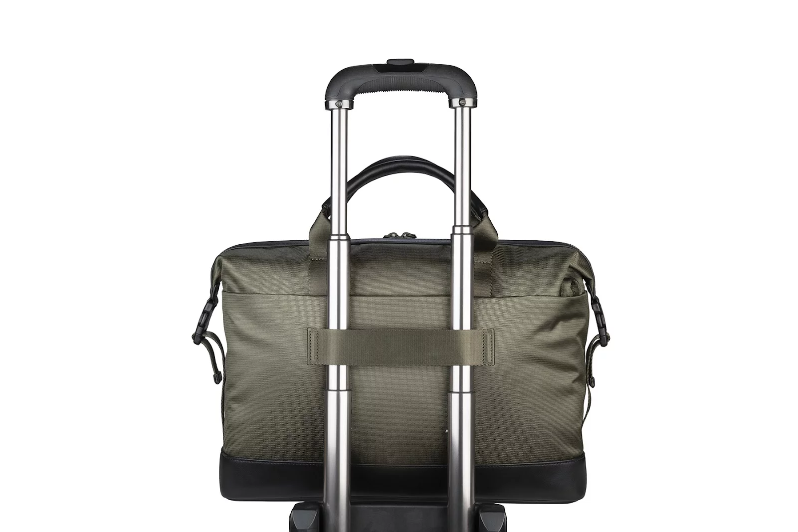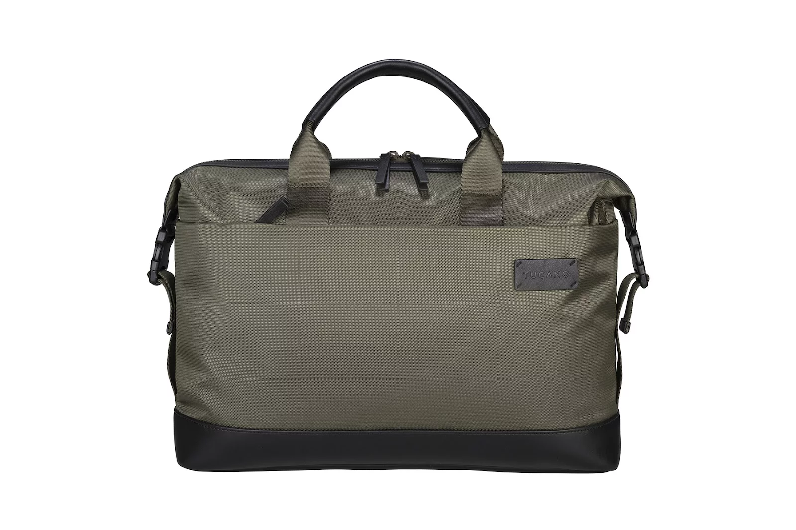 Ділова сумка з тканини, виготовленої з переробленого пластику, має деталі оздоблення з натуральної шкіри. Внутрішнє відділення з захисною кишенею для ноутбуків 15.6/16" або MacBook Pro 16". Широкий верхній отвір з легким доступом, (ширина отвору регулюється з обох боків за допомогою бічних ремінців і фіксується карабінами фасткес). Сумка Tucano Modo Premium 16 має добре організований внутрішній простір та кишеню для аксесуарів на передній частині. На зворотній стороні сумки інтегровано пасок-кріплення для розміщення та фіксації сумки на телескопічній ручці валізи.