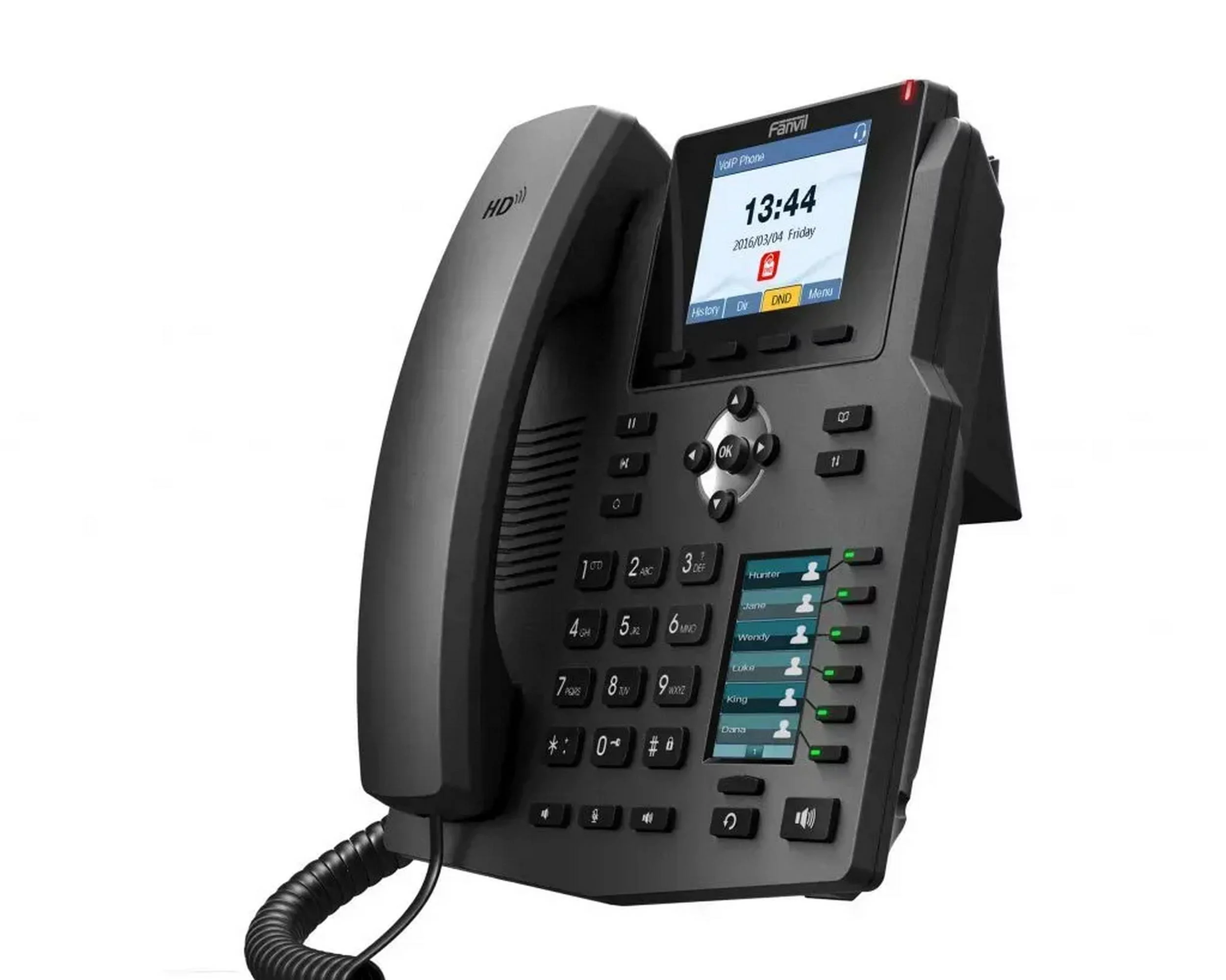 IP-телефон Fanvil X4 із кольоровим 2.8" дисплеєм та додатковим 2.4" екраном для 30 DSS-клавіш забезпечує зручне керування викликами. Пристрій підтримує 4 SIP-лінії, конференції на 3 абоненти та сучасні функції управління дзвінками. Якість HD-аудіо гарантує чіткий звук у трубці та гучномовці. Телефон оснащений двома Ethernet-портами 10/100 з PoE і сумісний із провідними VoIP-платформами.