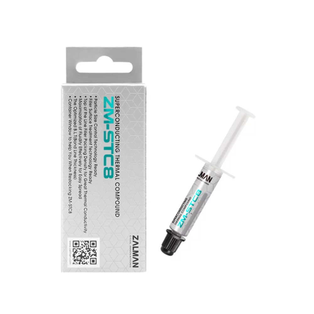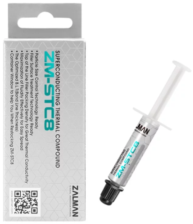 З термопастою Zalman ZM-STC8 вас ніколи не потурбують перебої в роботі комп'ютера через його перегріву процесора. Модель відрізняє зручна упаковка, завдяки чому з нею зручно працювати і також комфортно згодом зберігати залишки невикористаного матеріалу. До достоїнств ZALMAN ZM-ЅТС8 можна віднести вражаючу теплопровідність. З ZALMAN ZM-ЅТС8 все тепло, створюване процесором, буде передаватися встановленій системі охолодження.