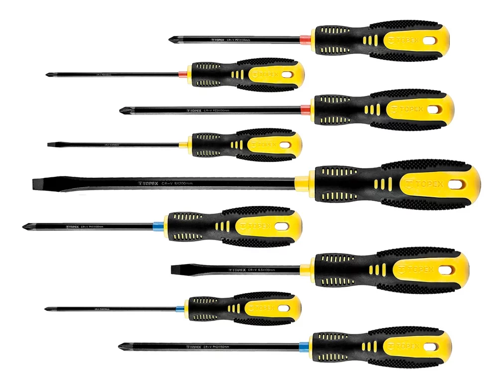 Набір викруток TOPEX призначений для виконання механічних робіт, а також робіт, які виконуються майстрами-аматорами. Стрижень кожної з дев'яти викруток виготовлений з міцної хромомолібденової сталі, що забезпечує довгий термін служби інструменту. Магнітне жало із загартованої сталі полегшує роботу з інструментом. Ергономічна пластикова рукоятка, покрита антиковзаючим матеріалом, забезпечує комфорт і безпеку під час роботи. Бренд TOPEX призначений для домашніх майстрів.