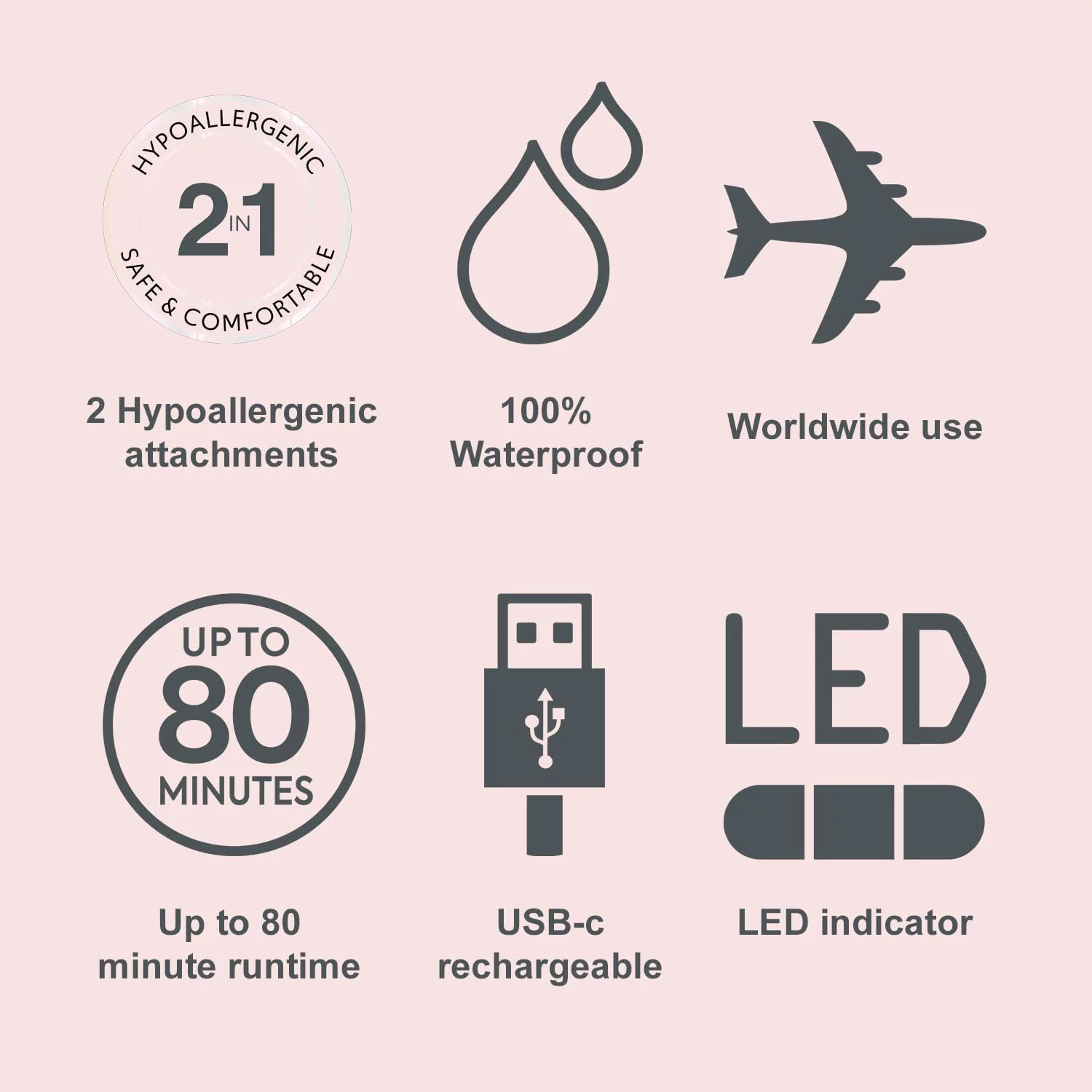Remington WFS200 формує точні контури брів та видаляє волосся з носа й вух завдяки двом насадкам з нержавіючою сталлю. Вбудоване LED-підсвічування забезпечує контроль у зонах з обмеженим доступом, роторний мотор потужністю 5 Вт працює автономно до 80 хвилин після заряджання 90 хвилин через USB-C. Повна водонепроникність дозволяє очищувати під струменем води, індикатор сигналізує про рівень заряду.