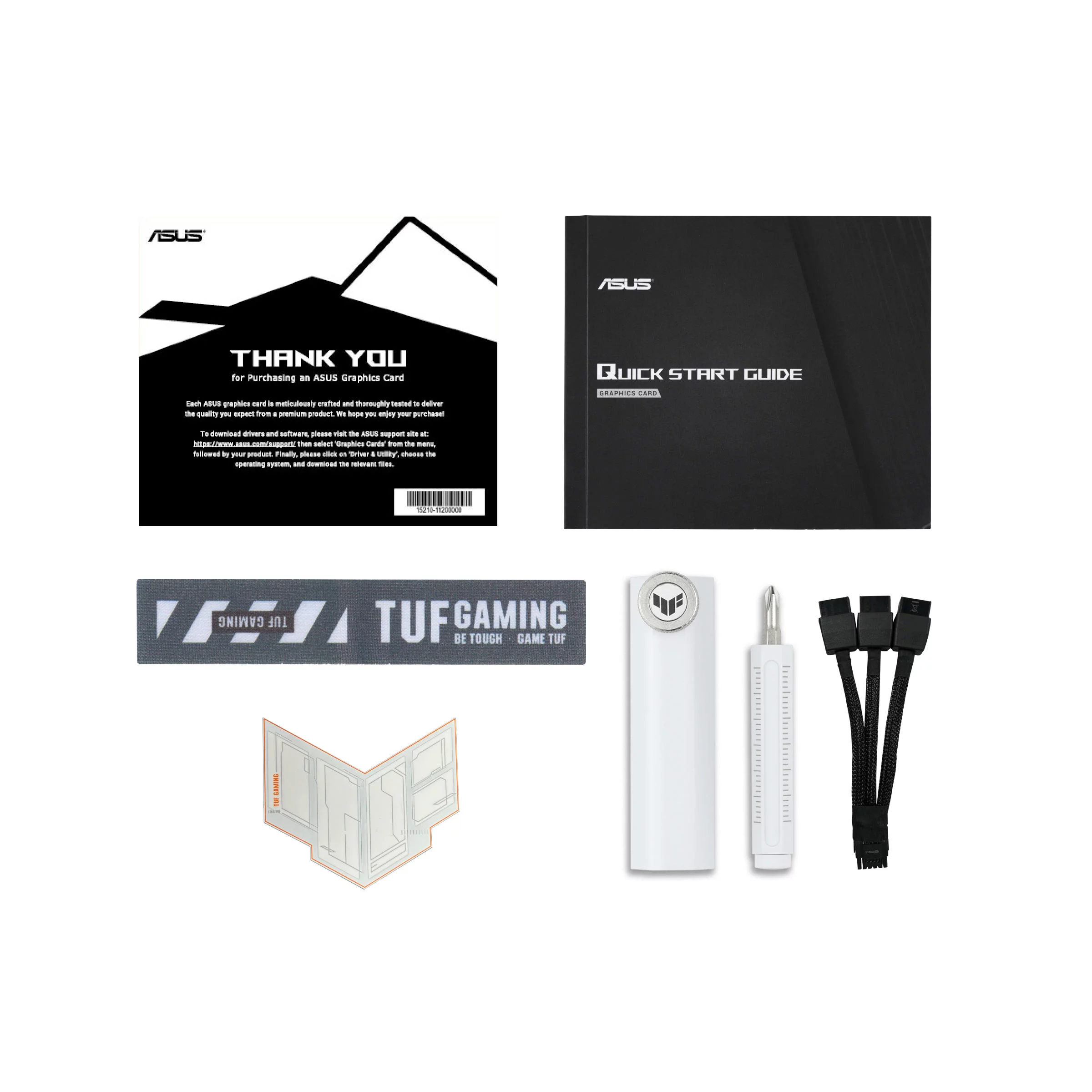 1 x Adapter Cable (1 to 3), 1 x Speedsetup Manual, 1 x Thank you card, 1 x TUF Gaming Certificate, 1 x TUF Graphics card holder, 1 x TUF Magnet, 1 x TUF Velcro Hook & Loop