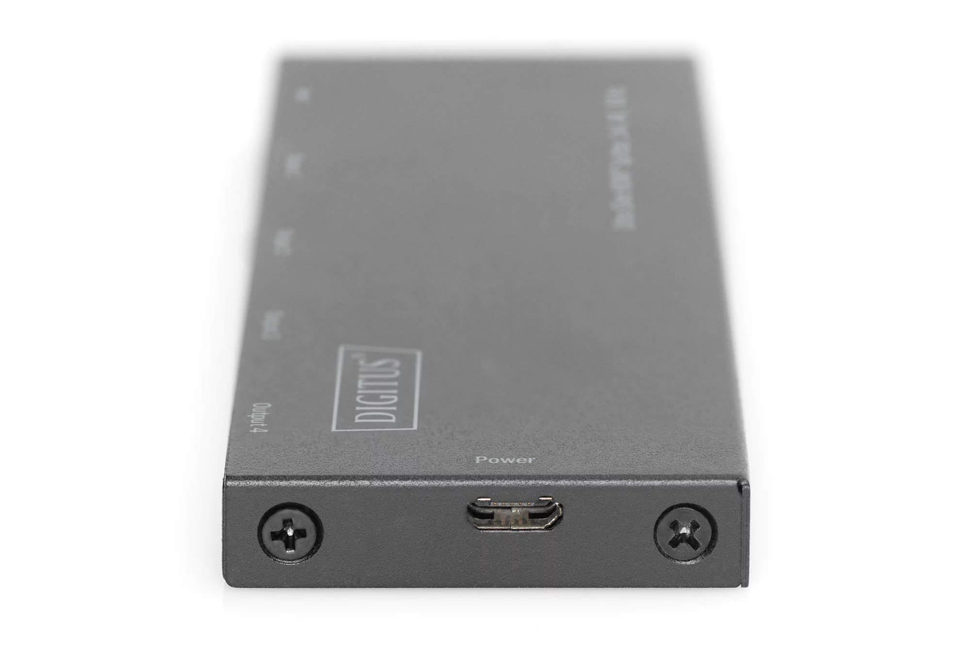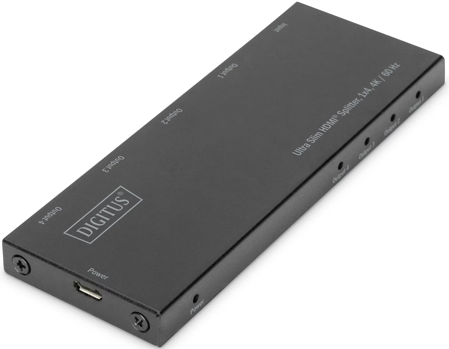 Високопродуктивний розгалужувач DIGITUS розділяє аудіо- та відеосигнали вашого HDMI-пристрою на чотири екрани, телевізори або проектори з роздільною здатністю UHD 4K / 60 Гц. Більше не потрібно повторно під'єднувати кабелі. Крім того, підтримуються HDR, HDCP 2.2 і 3D - загальною пропускною здатністю 18 Гбіт/с для плавного відтворення у відмінній якості. Розгалужувач HDMI можна живити через наявний USB-порт, розташований на телевізорі, або через USB-адаптер для заряджання від електромережі. Ви можете каскадувати кілька розгалужувачів до 8 рівнів.