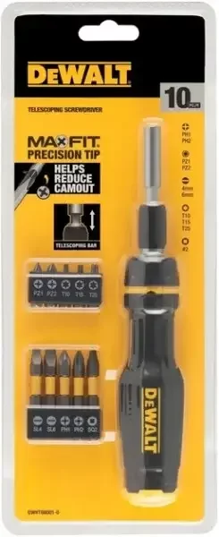 Викрутка DeWalt FULL FIT Telescoping DWHT68001-0 — універсальний ручний інструмент із телескопічним подовжувачем і набором із 10 змінних насадок. Двокомпонентна ергономічна ручка з протиковзким покриттям забезпечує комфортне утримання під час тривалої роботи. FULL FIT-насадки щільно фіксуються в магнітному тримачі, зменшуючи прослизання гвинта. Телескопічна конструкція дозволяє працювати як у важкодоступних, так і у вузьких місцях, зберігаючи точність та контроль.