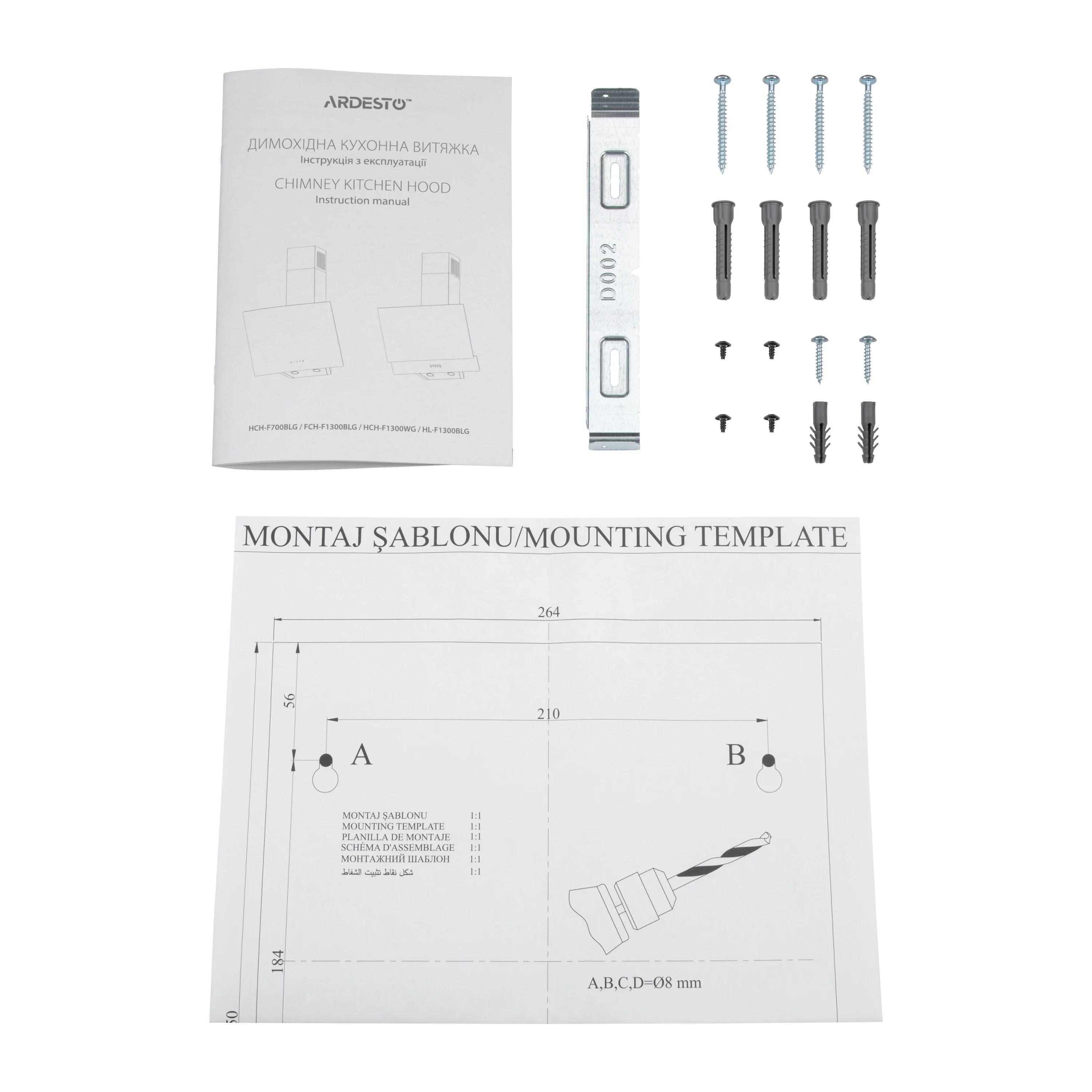 інструкція, кабель живлення з вилкою європейського зразка довжиною 1.3 м, кухонна витяжка , монтажний комплект