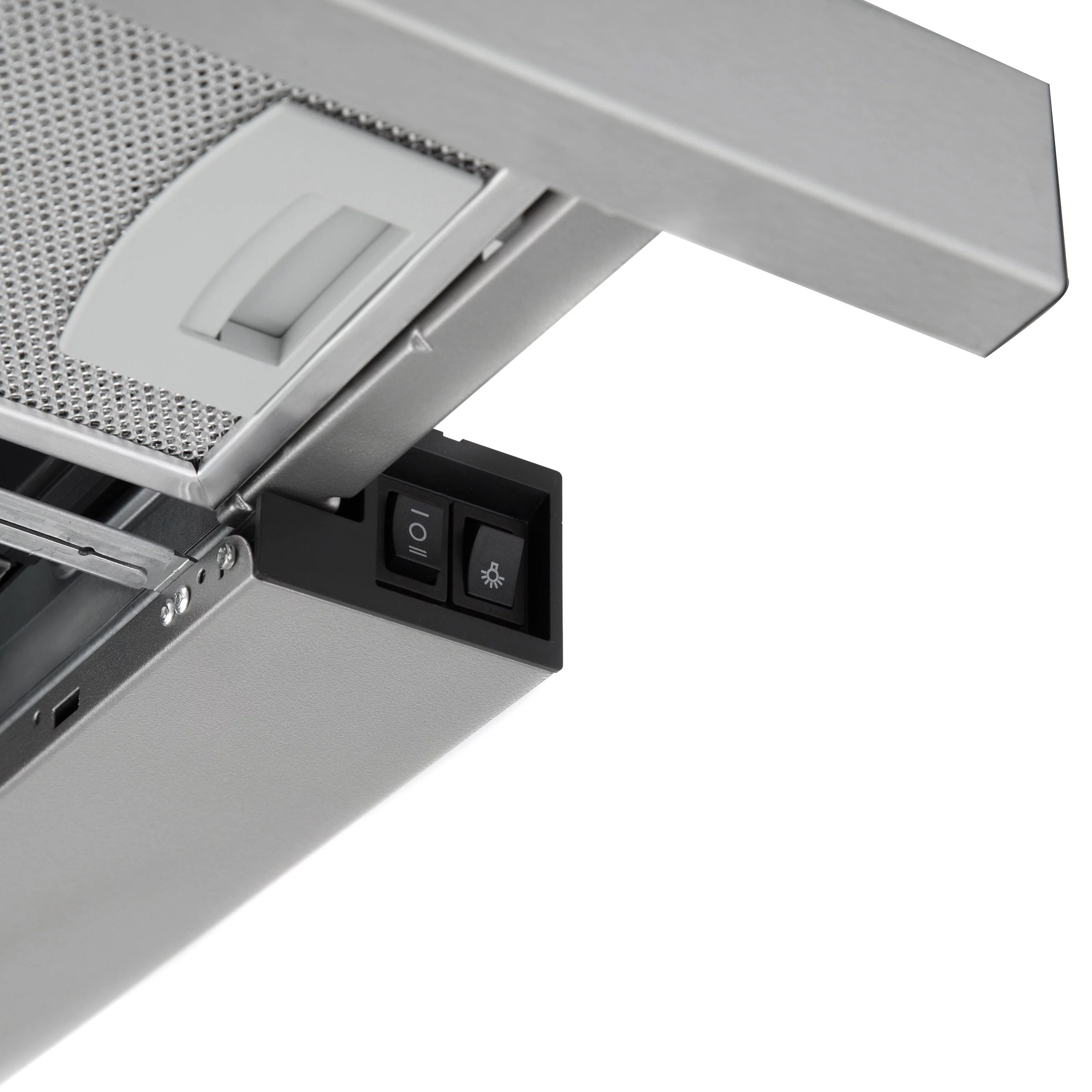 Телескопічна витяжка ARDESTO завширшки 60 см вирізняється компактністю і продуманою конструкцією, забезпечуючи ефективне очищення повітря. Завдяки висувній панелі модель легко інтегрується в кухонний гарнітур, а в робочому положенні охоплює всю варильну поверхню, вловлюючи пару та запахи. Витяжка суцільнометалева, навіть видима поверхня, що зумовлює міцність і довговічність.