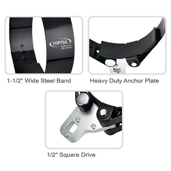 - Посилена конструкція: сталева стрічка шириною 1-1/2" забезпечує міцне захоплення та стійкість до деформацій під час застосування високого крутного моменту.